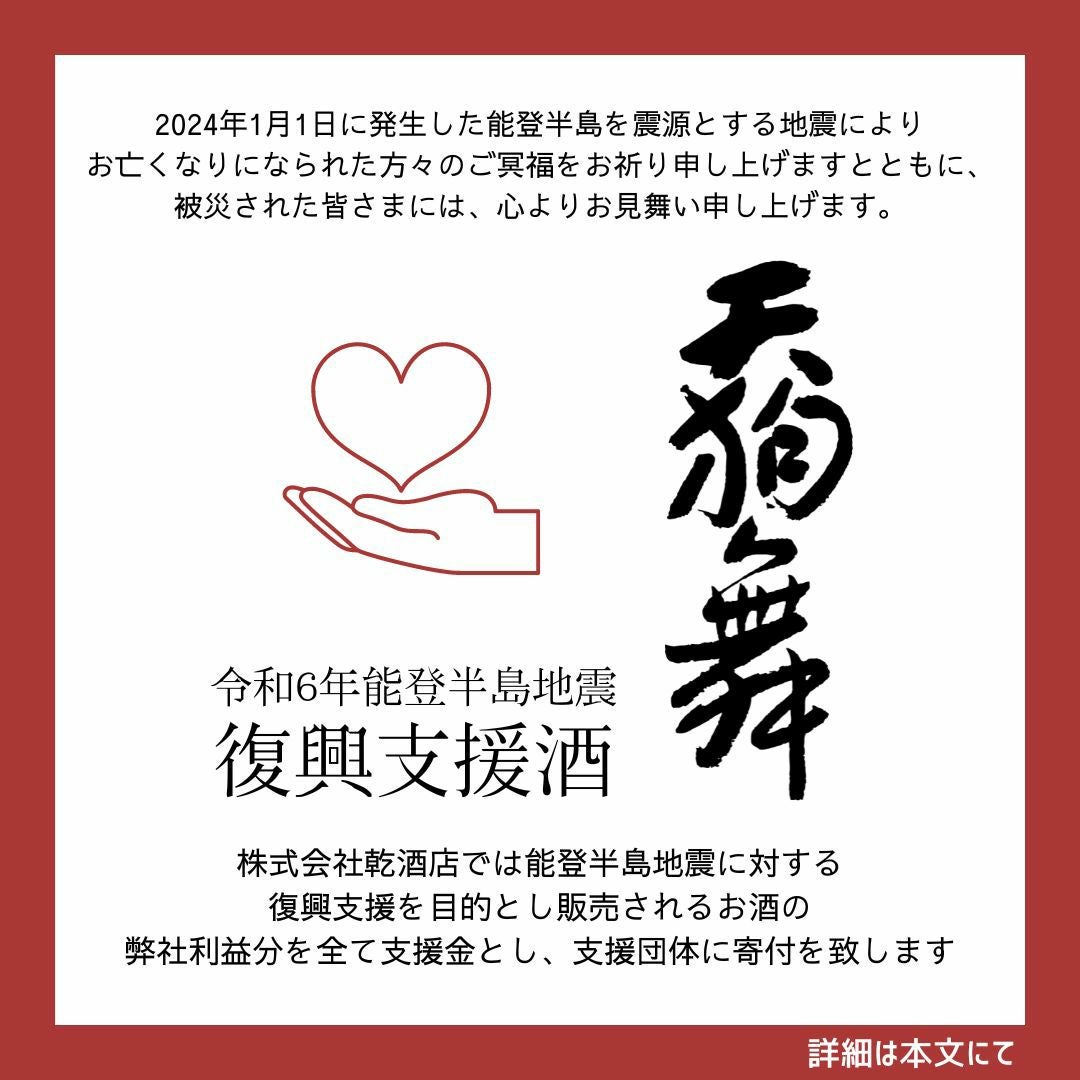 他の画像を見る 車多酒造(石川) 天狗舞(てんぐまい)山廃純米 復興支援酒720ml クール便でお届け 価格 ¥ 2,420 税込 在庫切れ 令和6年能登半島地震に対する義援金を募ることを目的とした復興支援酒 詳細を見る お気に入りに登録する